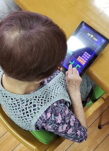 タブレットを使って、脳トレを頑張っていただいています。